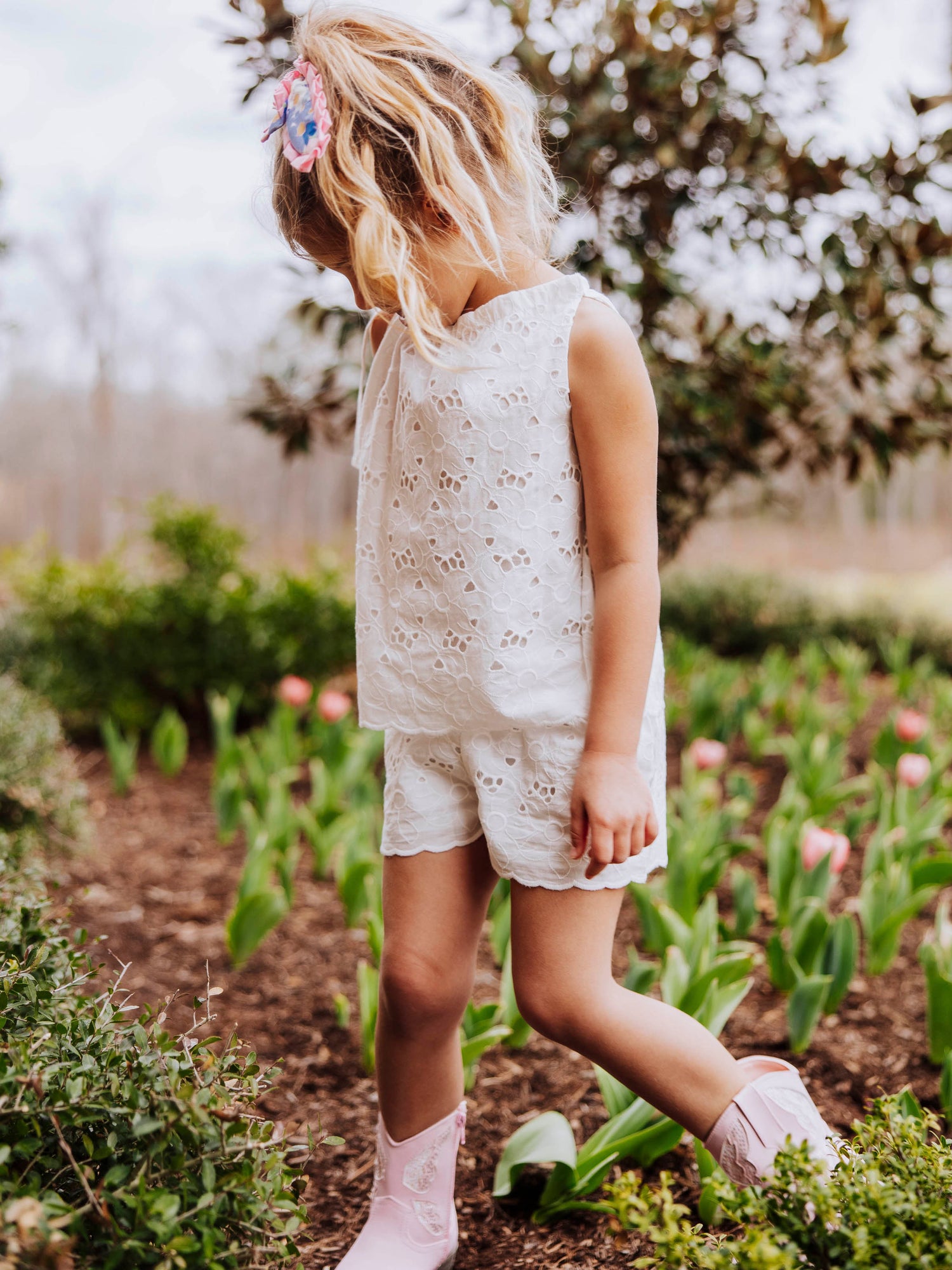- 4T-12Y elastic waistband, pockets, and scalloped eyelet lace at hem