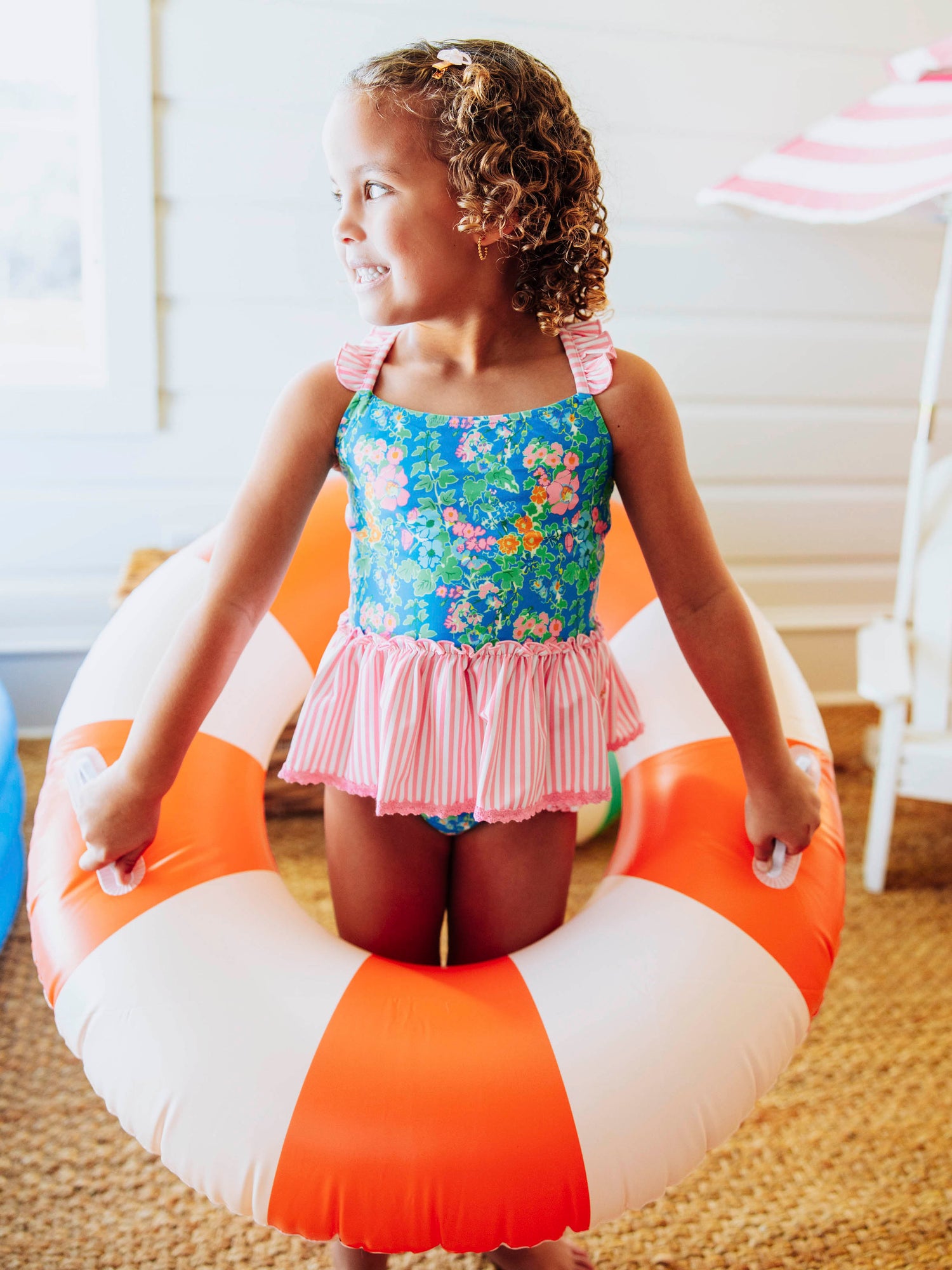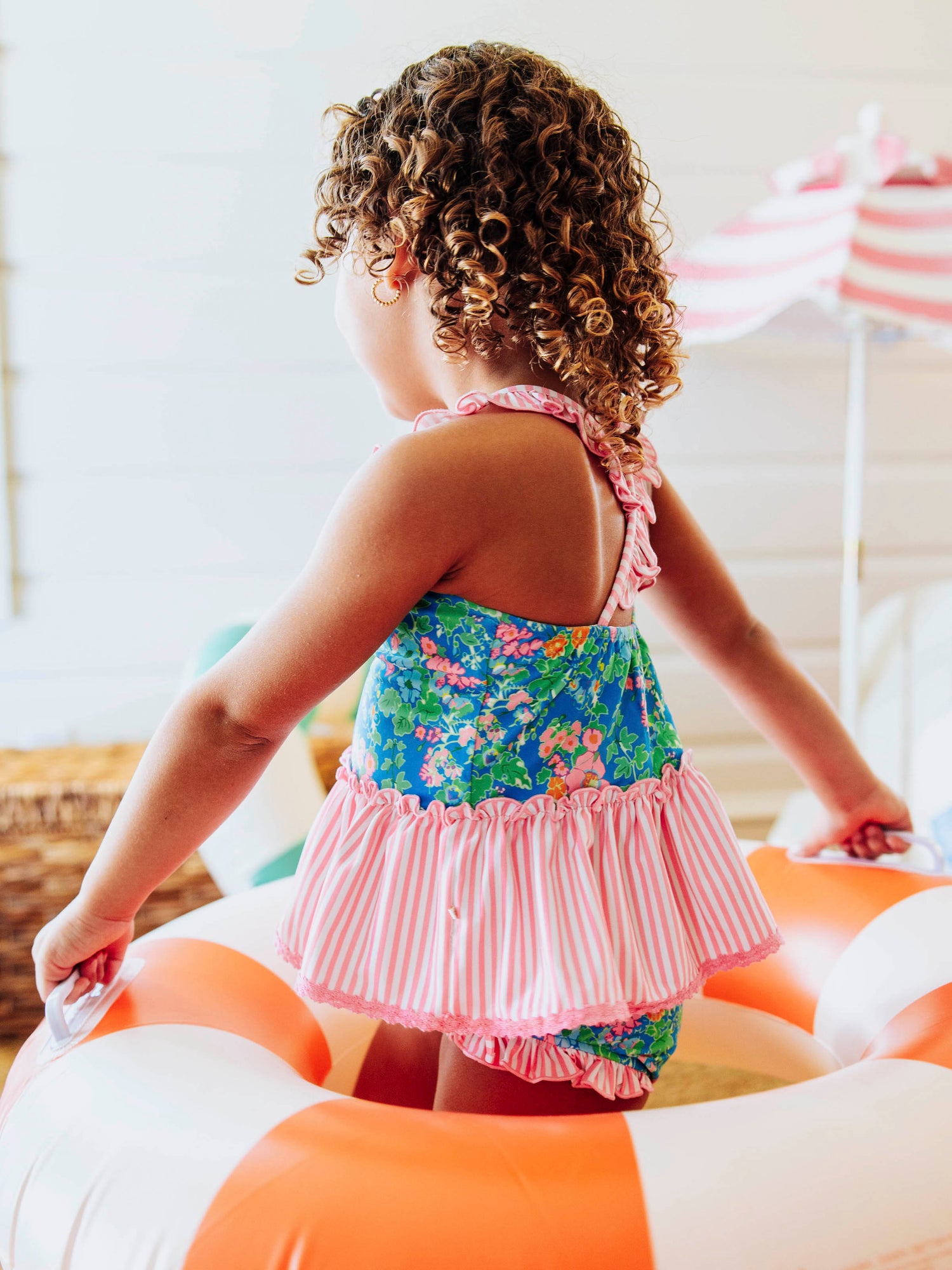 - Ruffles at leg openings