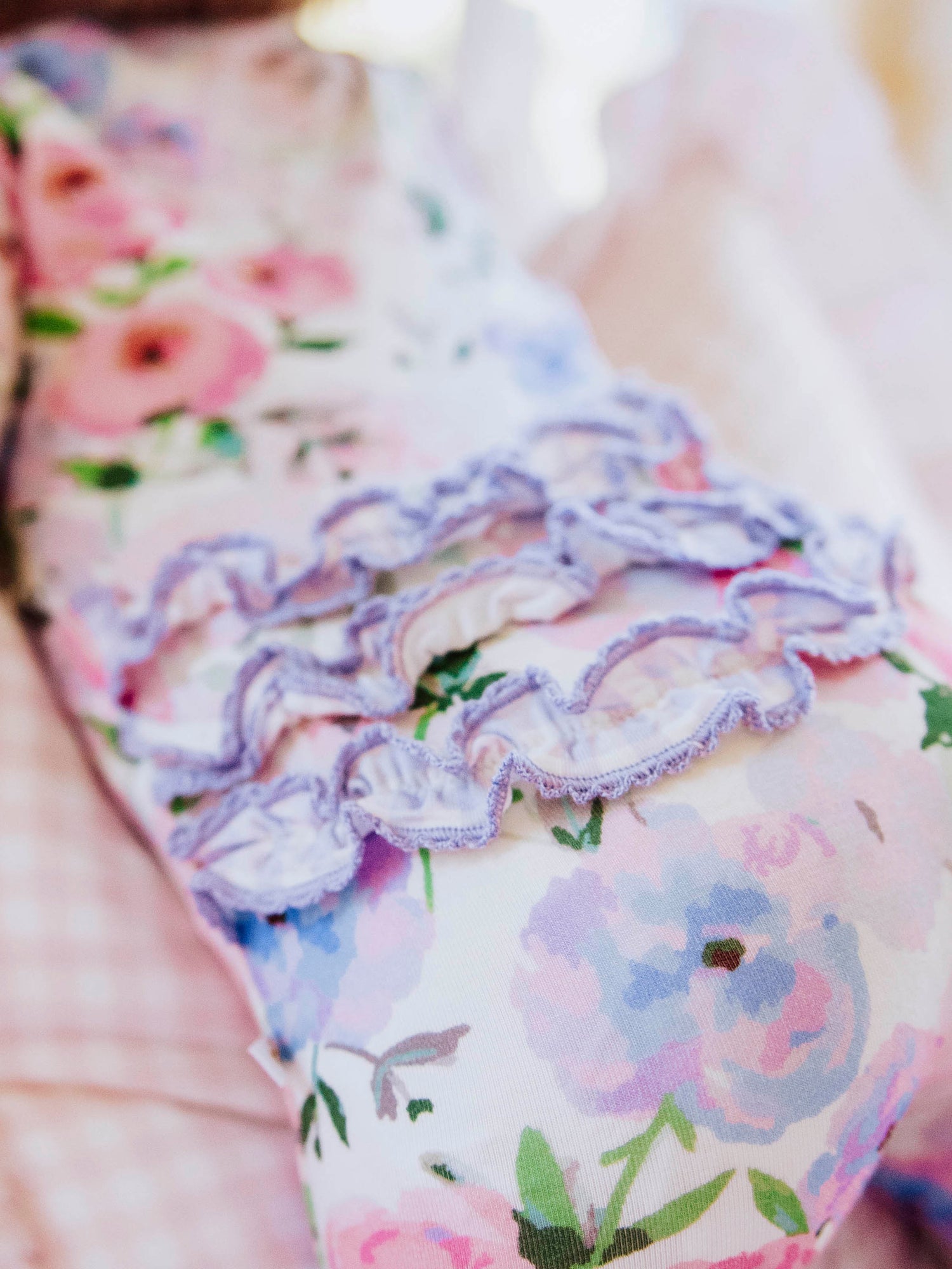 - Scalloped trimmed ruffles down front and on bottom