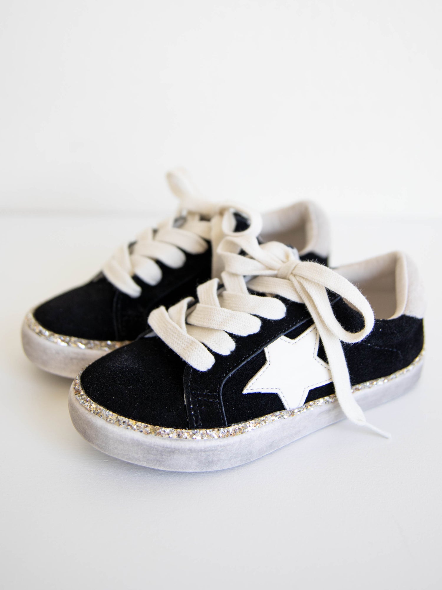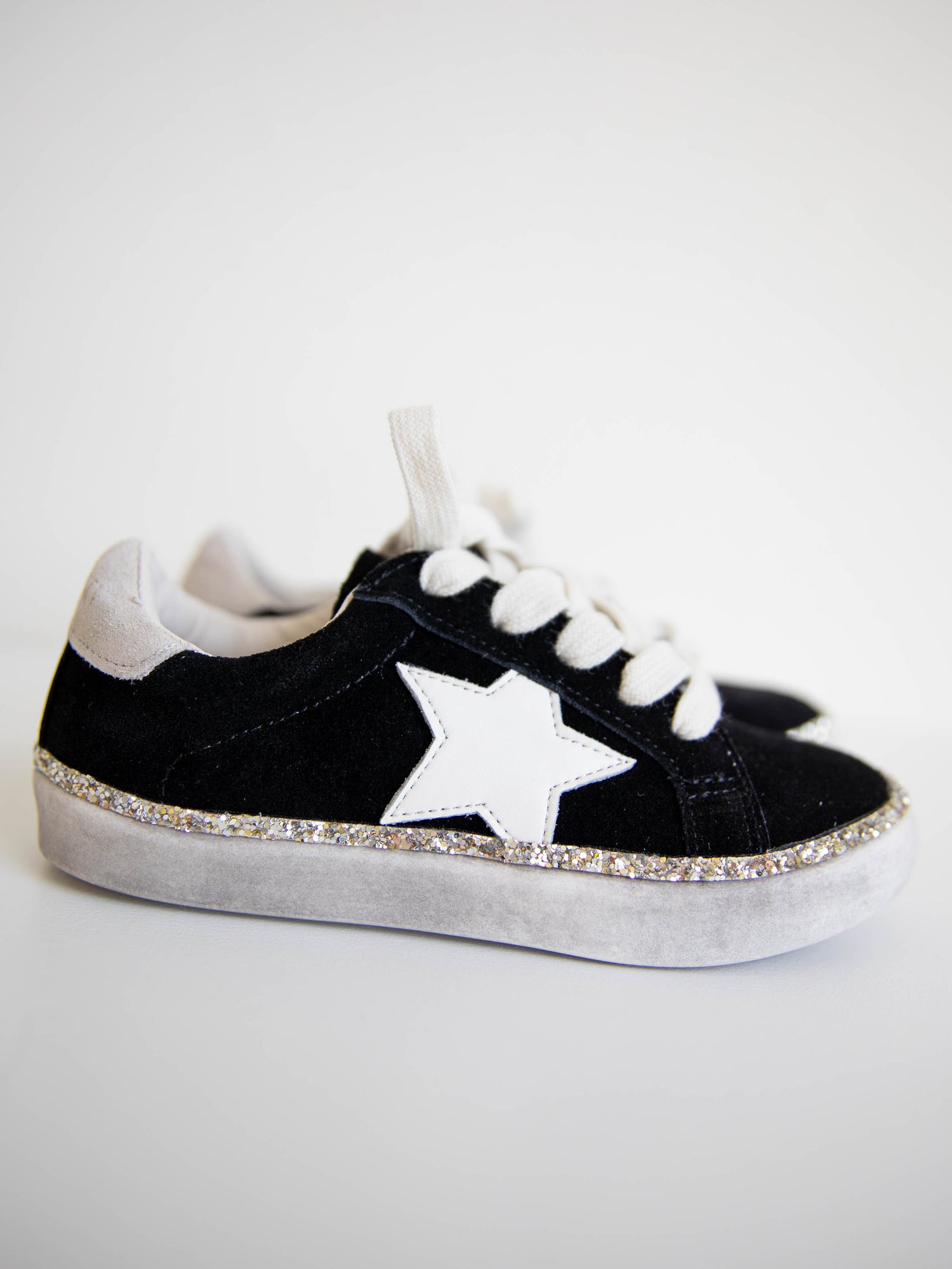 - Soft suede with a glitter trim that wraps around midsole